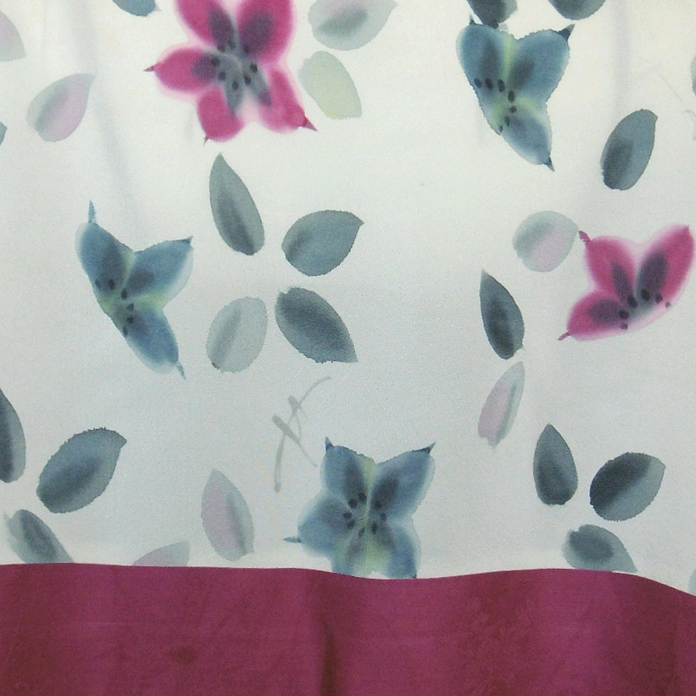 1. Yuzen kimono (100% silk). Hand paint Yuzen: off white base color with a fuchsia and blue gray Japanese bellflower.