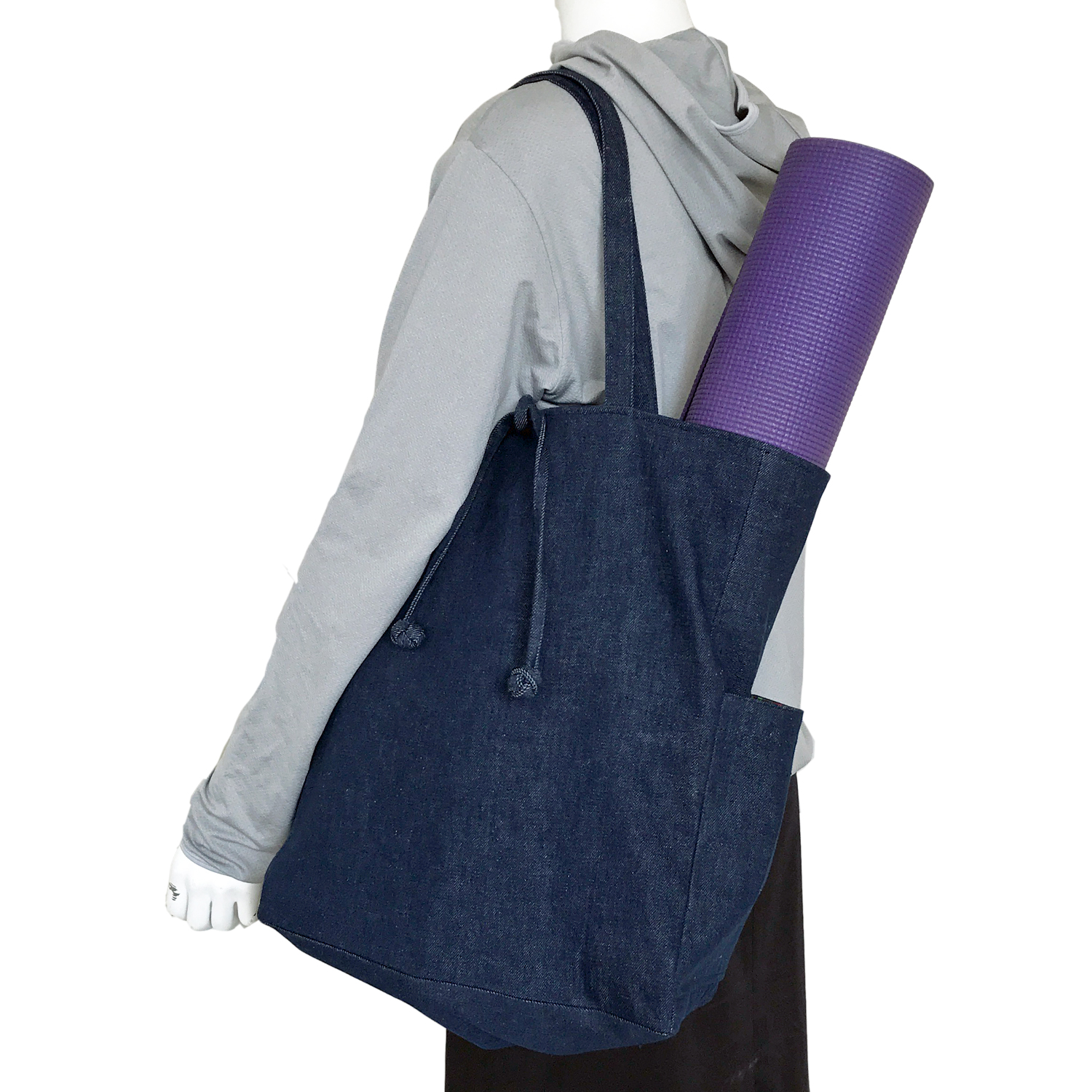 Super cool! Tote bag is big enough to fits in a yoga mat and all your yoga essentials. Fully lined with 2 Exterior and 2 Interior side open pockets for your water bottles & your other personal belongings. This large yoga mat tote bag is ideal for use in shopping, picnicing and other purposes. Two long shoulder handles. Handmade knots cord tie-top closure.